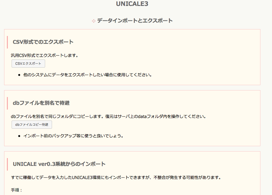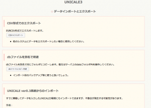 UNICALE Ver0.3系統と2.0系統からのデータインポート機能を備えています。方法はデータインポートページにある説明を参照してください。