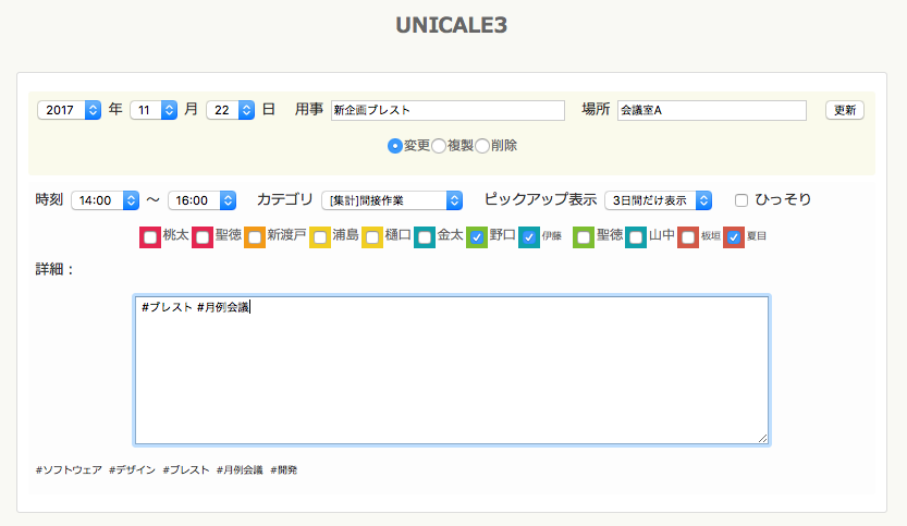 カレンダー内の既存の予定をクリックすると,編集モードになります。